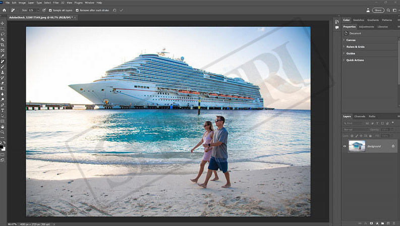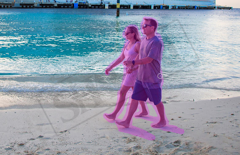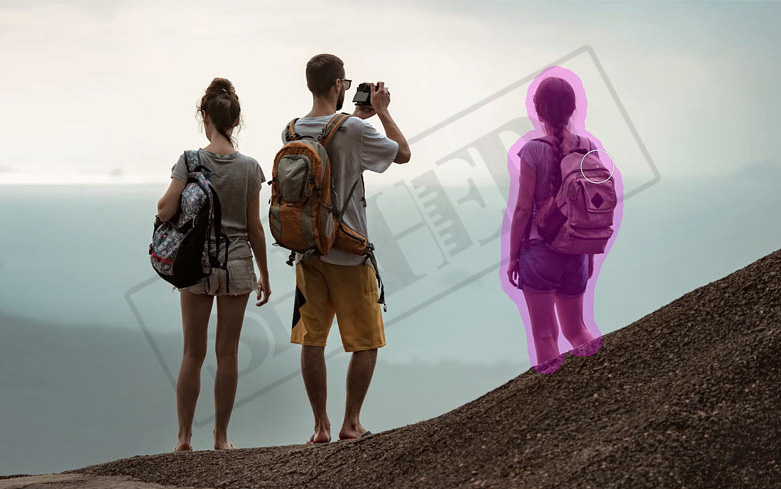فرض کنید میخواهیم هر دو شخص حاضر در تصویر را حذف کنیم؛ همانطور که قبلاً اشاره شد، با ابزار Remove Tool و بدون برداشتن دست از ماوس هر دو را مشخص میکنیم؛ دقت داشته باشید که سایهها فراموش نشوند!