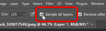 از نوار بالا(تنظیمات Remove Tool)، تیک مربوط به Sample All Layers را بزنید تا این ابزار روی لایۀ خالی جدیدی که ایجاد کردیم هم عمل کند(در غیر این صورت فقط روی لایۀ اصلی که شامل تصویر است عمل میکند).