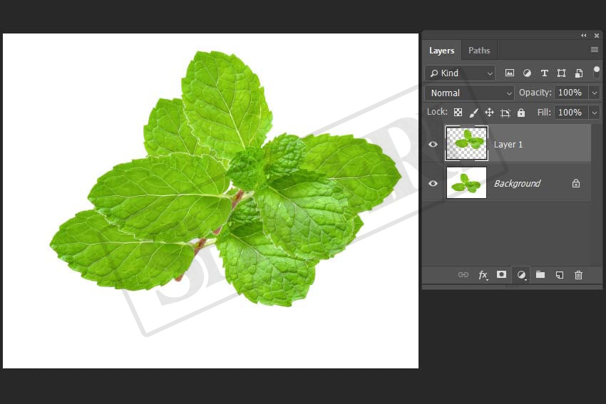 بعد از انتخاب ناحیه، برای جدا کردن آن قسمت از تصویر، میتوانید از شورتکی Ctrl+C(برای کپی کردن) یا Ctrl+X(برای کات کردن) استفاده و با زدن Ctrl+V آن را به یک لایۀ جدید تبدیل کنید (در تصویر زیر، بعد از کپی کردن سوژه، یک فایل جدید باز شده و آنجا Paste انجام شده است).