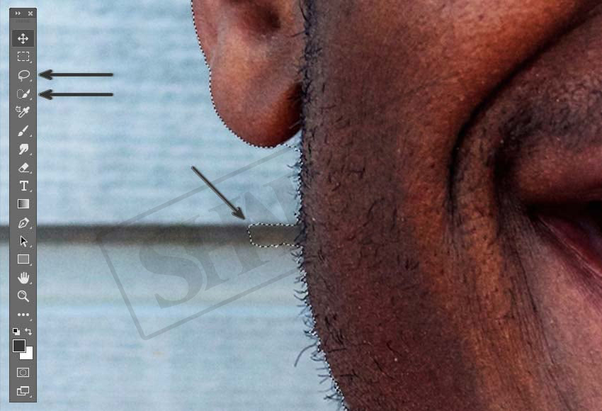 حالا برای اینکه قسمتهای اشتباه را تصحیح کنیم، به Lasso Tool احتیاج داریم که باز هم در نوار ابزار سمت چپ قابل انتخاب است. بعد از انتخاب ابزار، برای اضافه کردن یک قسمت جدید به ناحیۀ انتخابشده، کافیست Shift را نگه دارید و با دکمۀ چپ ماوس شروع به اضافه کردن کنید. همچنین برای حذف یک قسمت از ناحیۀ انتخابشده میتوانید همین کار را ولی با دکمۀ Alt انجام دهید.