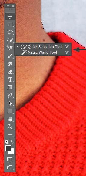 ابزارهای دیگری که در زمینۀ انتخاب سوژه میتواند مفید باشند، Quick Selection Tool و Magic Wand Tool هستند. این دو ابزار هم از منوی سمت چپ در دسترساند. کار با این دو بسیار راحتتر از Lasso است اما دقت پایینتری دارند و تفاوت آنها با Lasso این است که به جای اینکه شما محیط(اطراف) سوژه را با آنها انتخاب کنید، نواحی داخلی آن سوژه را انتخاب میکنید؛ روش انتخاب هم براساس شباهت رنگ و کنتراست قطعهها خواهد بود.