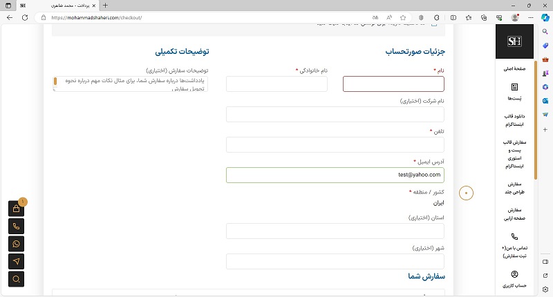 اگر قبلاً مشخصات حساب خود را وارد کرده باشیم، یا یک بار خرید انجام داده باشیم، در اینجا تمامی مشخصات مثل قبل پر خواهند شد(درصورتی که قبلاً روی سیستم خود، هیچ پروتکل خاصی برای جلوگیری از ثبت کوکیهای سایت نداشته باشید)؛ در غیر اینصورت فیلدهای این صفحه(بخصوص فیلدهای اجباری) را با مشخصات واقعی پر میکنیم(چون ممکن است نیاز به ارتباط با شما باشد و مهم است که مشخصاتتان واقعی باشند).