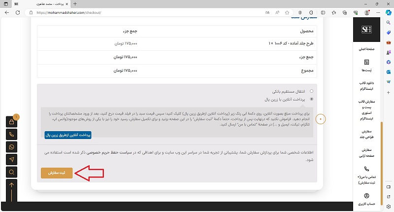 در مرحلۀ بعد که مهمترین تفاوت این وبسایت با بسیاری از سایتهای آنلاین دیگر است، انتخاب روش پرداخت است. وقتی مشخصاتتان را وارد کردید، صفحه را به پایین اسکرول کنید. در اینجا دو انتخاب وجود دارد، 1. پرداخت بصورت کارت به کارت(با هر اپلیکیشن یا وب سرویسی که خودتان راحت هستید یا روشهایی مثل پرداخت با عابربانک و …) – 2. پرداخت ازطریق درگاه زرین پال. فراموش نکنید که در هر دو حالت، درنهایت برای تکمیل سفارش، لازم است از رسید نهایی خود عکس گرفته و از یکی از روشهای تماس با من برای بنده ارسال بفرمایید.