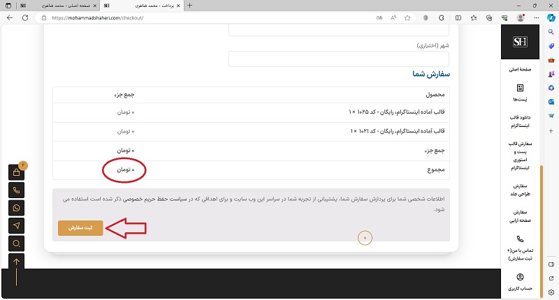 صفحۀ مشخصات را تا انتها به پایین اسکرول کرده و روی دکمۀ ثبت سفارش کلیک می‌کنیم.