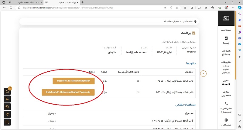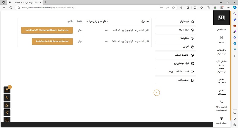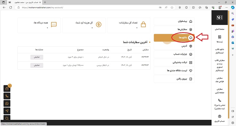 مراحل دانلود به پایان رسیده؛ اما تمامی فایل‌های رایگان که قبلاً انتخاب کردیم و سفارش‌های غیر رایگانی که قبلاً انجام شده و یا درحال انجام است، ازطریق صفحۀ کاربری همواره در دسترس هستند. برای رفتن به صفحۀ کاربری روی گزینۀ “ورود/عضویت” کلیک می‌کنیم.