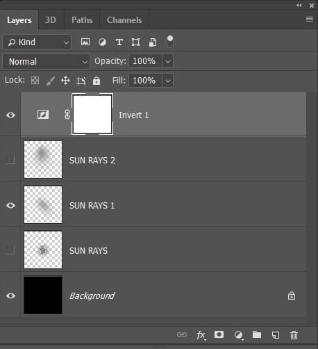 می‌خواهیم لایۀ Sun Rays1 را به یک براش تبدیل کنیم. برای این کار سایر لایه‌ها به‌جز Background وSun Rays1 را Invisible کنید. بعد، از منوی اصلی، Window را انتخاب و روی Adjustments کلیک کنید. در پنجره‌ای که باز شده، Invert را انتخاب کنید.