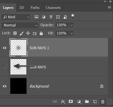 یک کپی از لایۀ Sun Rays بسازید(با کلیک راست روی آن و زدن دکمۀ Duplicate؛ یا درحالیکه این لایه فعال است، از کلید ترکیبی Ctrl+J استفاده کنید)؛ نام لایه را Sun Rays1 بگذارید. بعد، لایۀ Sun Rays اصلی را invisible کنید(با زدن چشم کنار این لایه).