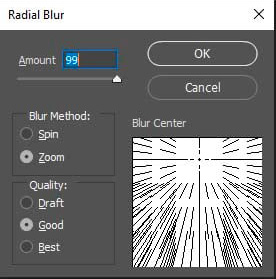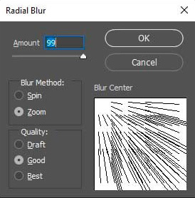 در پنجره‌ای که باز شده، مقدار(Amount) را روی 99، Blur Method را روی Zoom و Blur Center را روی گوشۀ چپ بالا تنظیم کنید.