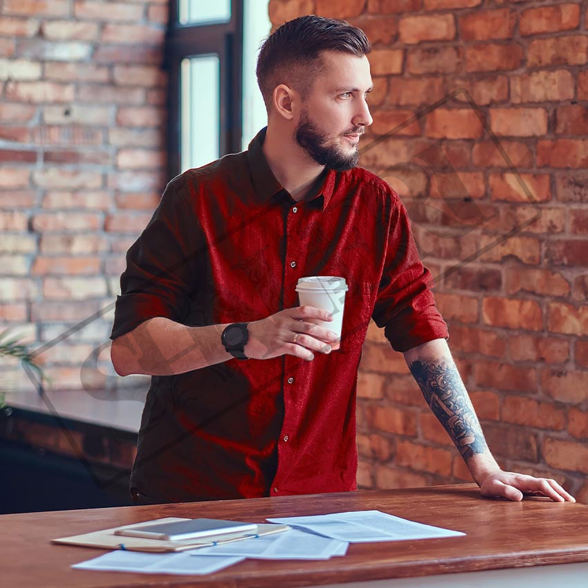 همانطور که مشخص است، کاغذهایی که روی میز بودند و یک هالۀ آبیرنگ داشتند هم به رنگ قرمز تغییر کردهاند؛ که البته مد نظر ما نبود. برای برگرداندن این قسمت به رنگ قبلی، از ماسک استفاده میکنیم. با ابزار Lasso قسمتهایی که مورد نظر شما بوده و بهدرستی تغییر رنگ برایشان انجام شده است(که در این تصویر، لباس فرد است) را انتخاب کنید؛ حالا از پایینترین قسمتِ بخشِ لایهها، روی آیکون Add a Mask کلیک کنید. به این ترتیب سایر قسمتهای این لایه پنهان شده و بهجای آنها، لایۀ پایین(که لایۀ تصویر اصلی شماست) نمایش داده میشود؛ نتیجۀ نهایی همان نتیجۀ مطلوب ما خواهد بود.
