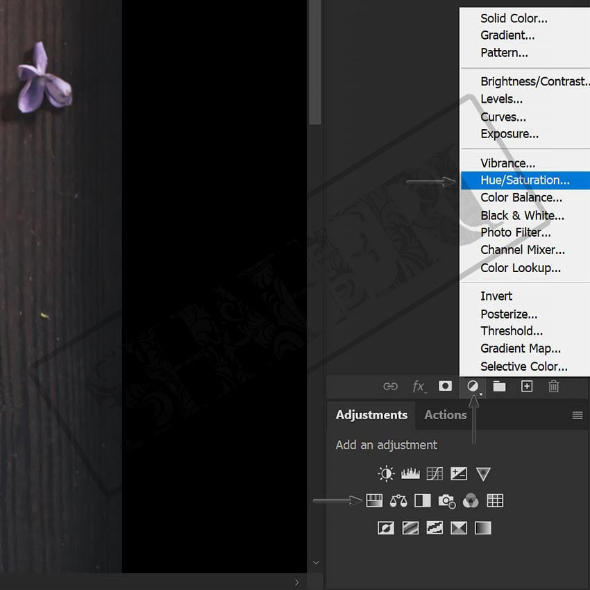 ابتدا یک لایۀ Hue/Saturation Adjustment در بالای تصویر اصلی باید ایجاد کنیم. برای این کار از نوار بالای فتوشاپ، تب Window، روی Adjustments کلیک کنید. (برای ساخت لایۀ Adjustment میتوانید از همان پنلِ لایههای فتوشاپ هم استفاده کنید(Icon دایرهای در پایینترین قسمت این پنجره؛ مانند تصویر زیر)